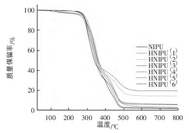 采用STA 409 PC/PG 型同步热分析仪上对NIPU及HNIPU 样品做热失重分析,温度30~800 ℃,升温速率10 ℃/min,氮气氛下测试。